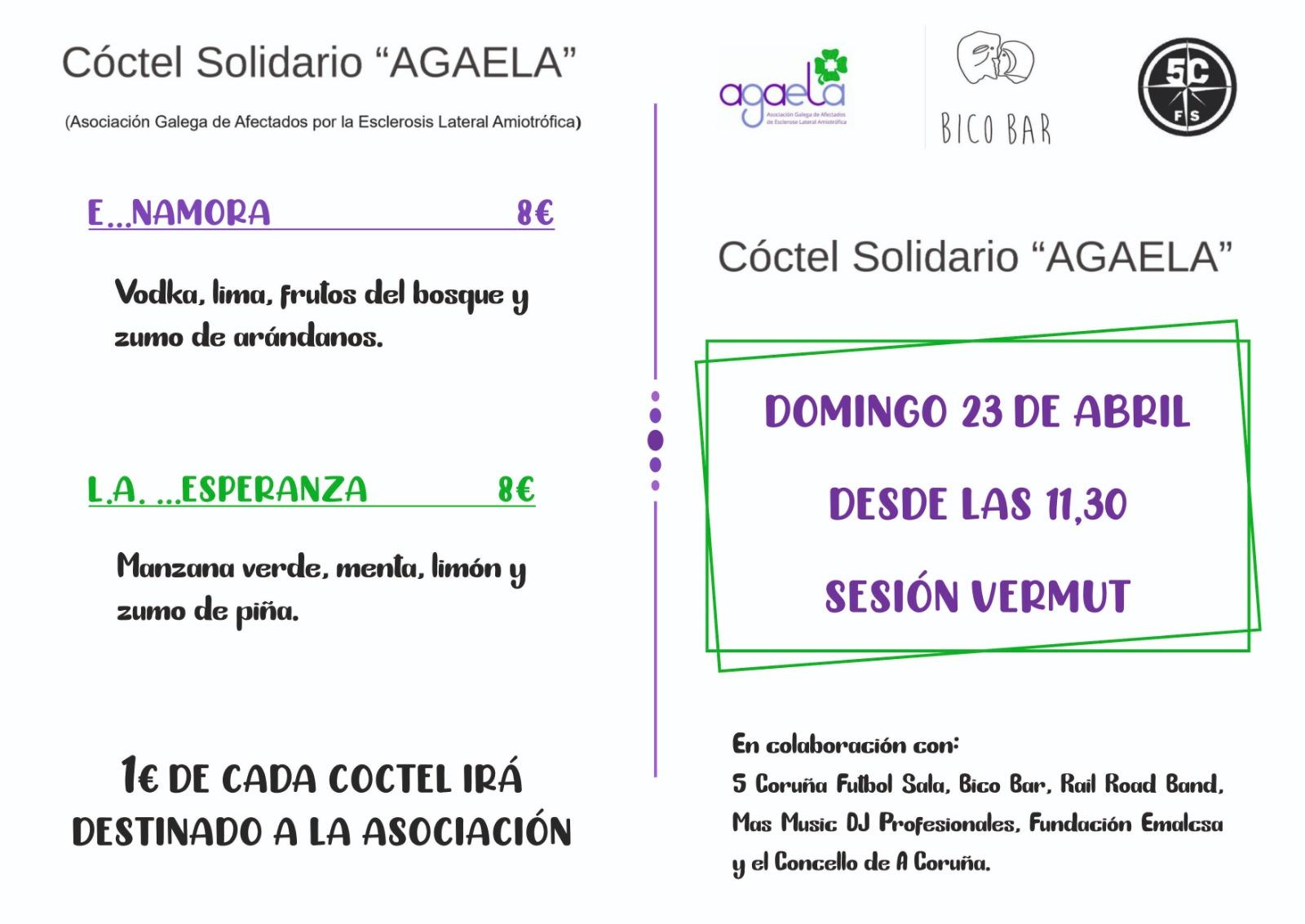 A Coruña contará este domingo 23 de abril con una sesión vermú muy especial gracias a un cóctel solidario para recaudar fondos para la Asociación Galega de Afectados pola Esclerose Lateral Amiotrófica (Agaela). El evento, que se celebrará en el Bico Bar y con el que colabora el 5 Coruña Fútbol Sala, fue presentado esta tarde en el propio local de hostelería de la travesía Orillamar.