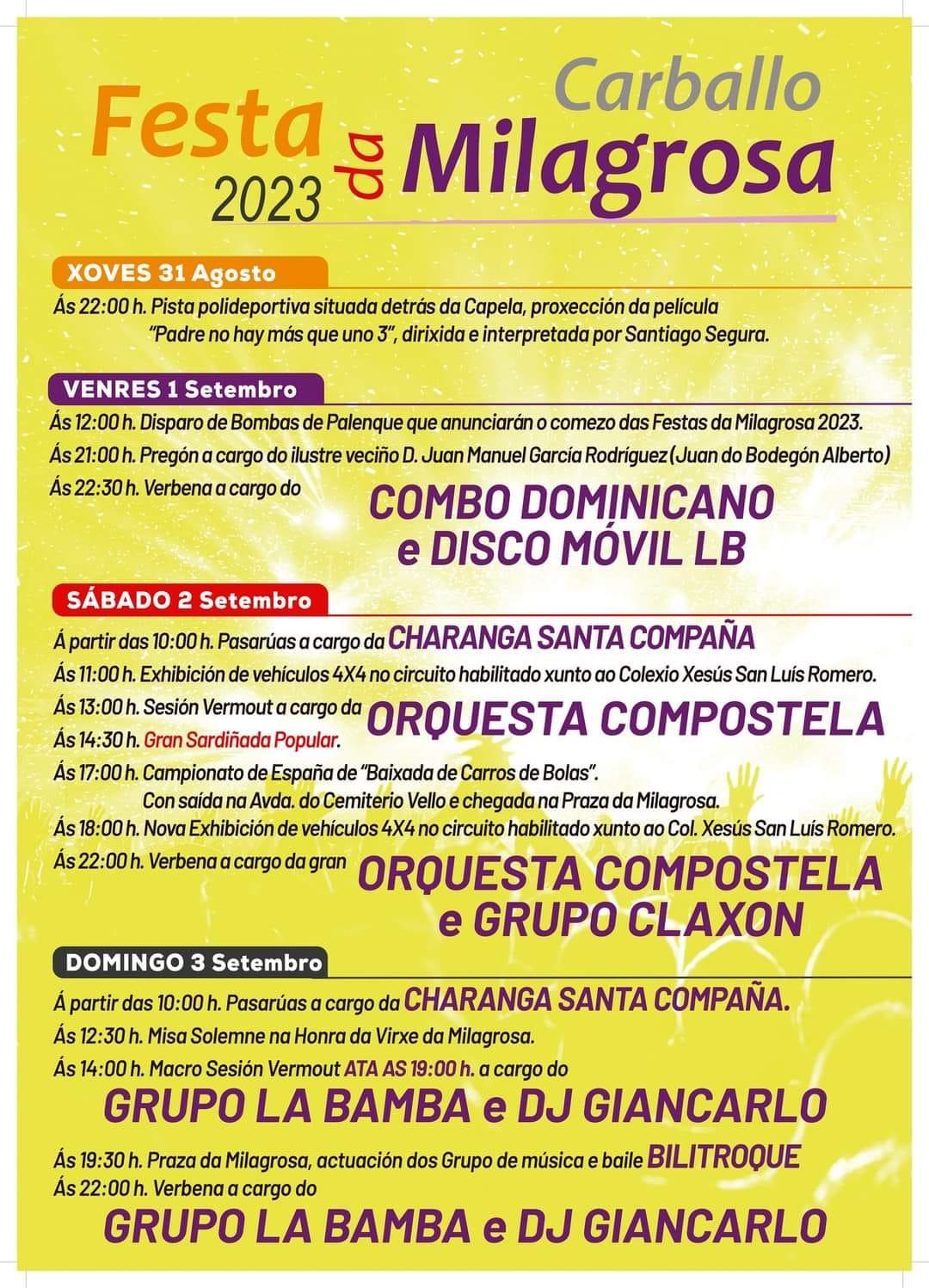 Tan solo quedan un par de días para que Carballo (A Coruña) de el pistoletazo de salida a la fiesta de la Milagrosa, que contará con varias verbenas, la proyección de una película y una nueva exhibición de vehículos 4×4. El programa también incluye una gran sardiñada popular y una macro sesión vermú amenizada por el grupo La Bamba y DJ Giancarlo.