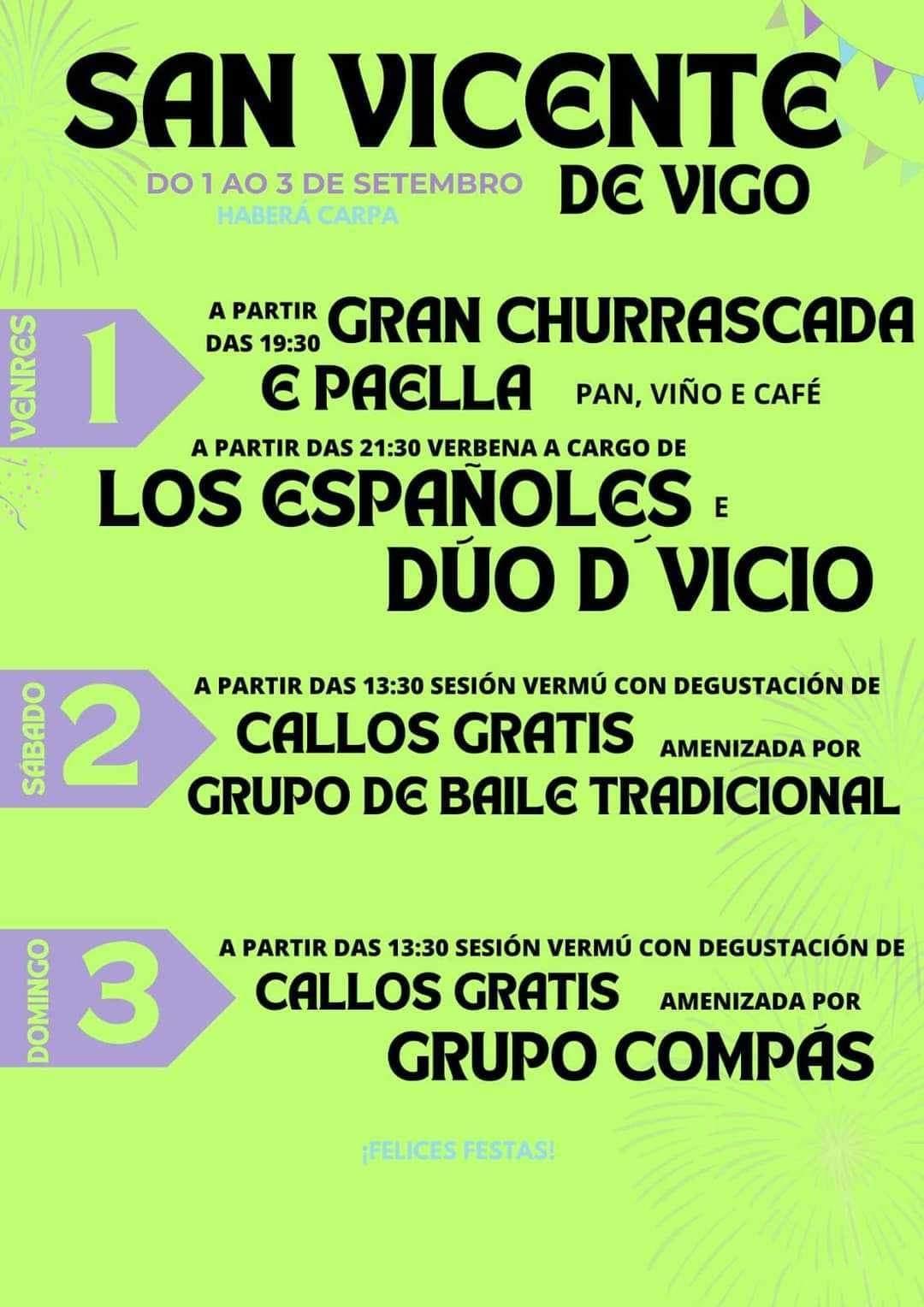 Churrascada, callos gratis y mucha música. Esta es la combinación perfecta para una fiesta en Galicia. Y así lo saben en San Vicente de Vigo. Esta parroquia del municipio coruñés de Carral celebra este fin de semana sus fiestas patronales. Del 1 al 3 de septiembre, la música y la gastronomía serán las grandes protagonistas.