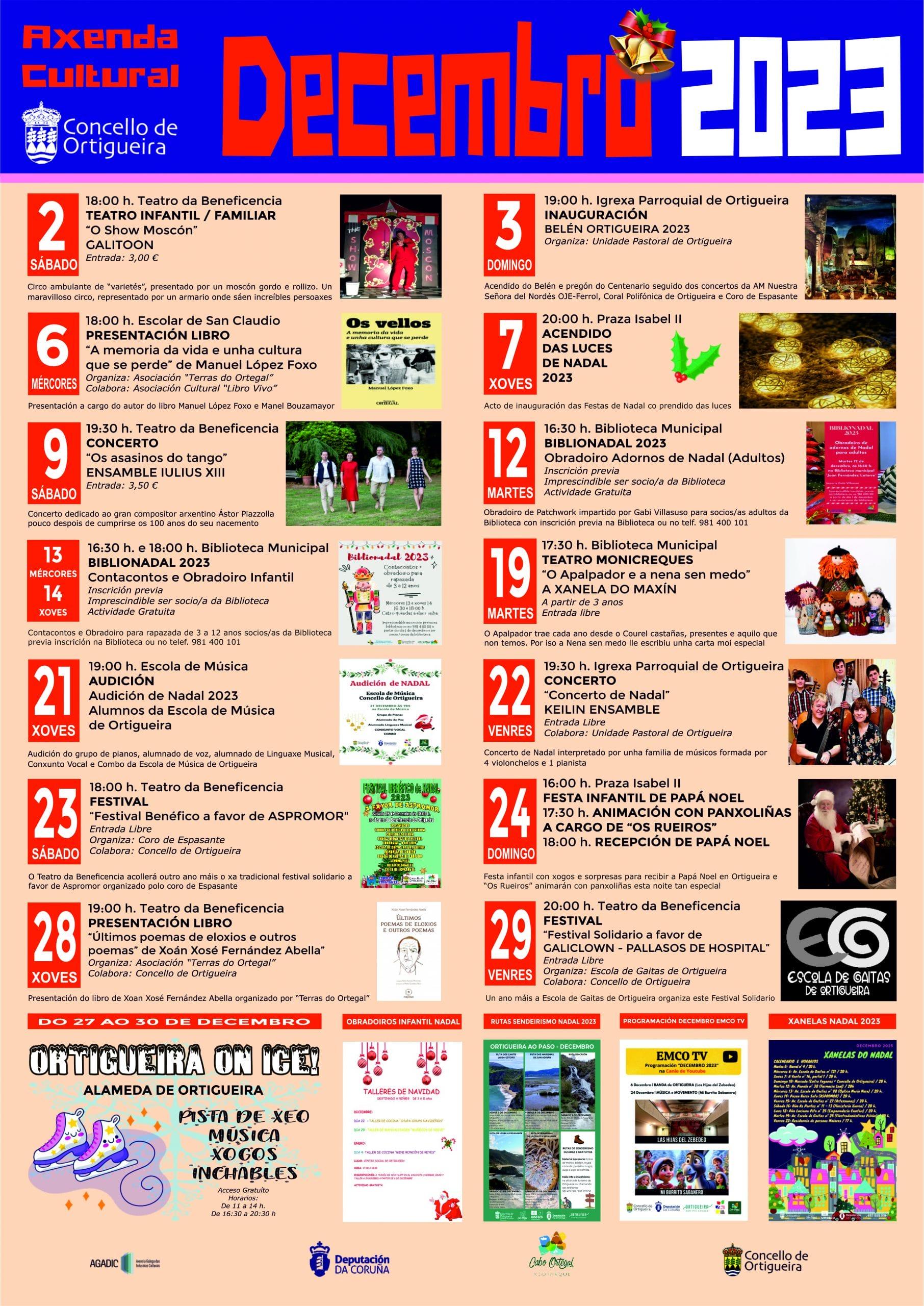 Ortigueira dará la bienvenida a la Navidad hoy, a las 20:00 horas, con el encendido de luces del municipio desde la Praza de Isabel II, y a partir del sábado ofrecerá multitud de actividades, como conciertos, talleres y teatro. El programa BiblioNadal 2023, para niños y adultos; un taller sobre patchwork de adornos de Navidad; cuentacuentos; teatro de títeres; un festival benéfico; presentaciones de libros; la llegada de Papá Noel; y rutas de senderismo son algunas propuestas, pero puedes consultar toda la programación en este enlace.