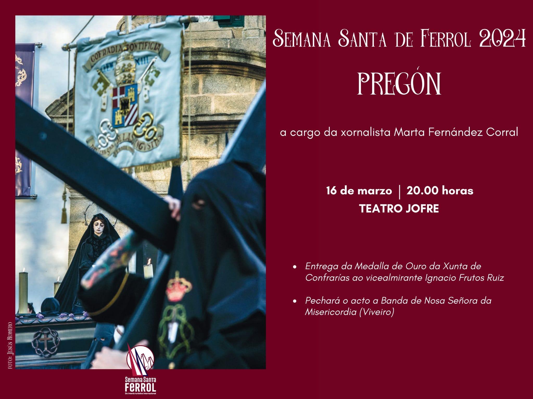 El Teatro Jofre de Ferrol acogerá este sábado, 16 de marzo, la lectura del pregón de la Semana Santa de Ferrol 2024, a cargo de la periodista ferrolana Marta Fernández Corral. Además, en el mismo acto la Junta de Cofradías y Hermandades entregará su Medalla de Ouro al vicealmirante Ignacio Frutos Ruiz.
