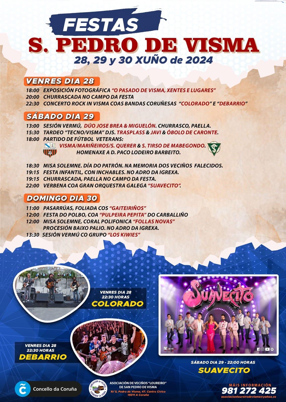 Las fiestas de verano de San Pedro de Visma en A Coruña se celebrarán este año los días 28, 29 y 30 de junio. La celebración comenzará en viernes y no parará hasta el sábado. Con actuaciones para todos los gustos y públicos, se ofrecerán conciertos de todo tipo, desde bandas de rock, hasta DJs, o verbenas con las mejores orquestas.
