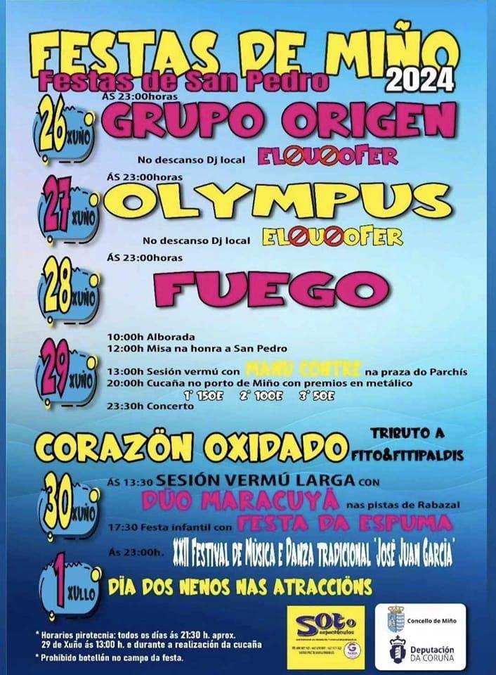 El jueves 28 estará por la noche la orquesta Fuego, mientras que el viernes 29 será el día grande de las fiestas de San Pedro de Miño -de hecho, es jornada festiva- y la programación arrancará a las 10:00 horas con alboradas y continuará a las 12:00 horas con una misa solemne, a la que le seguirá una sesión vermú con Manu Contre en la plaza do Parchís.