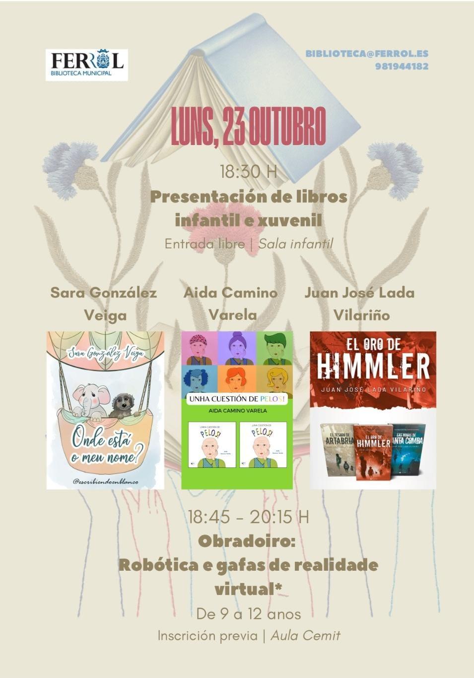 Hoy lunes, a las 18:00 horas, la Bibioteca central (plaza de España) acogerá la presentación de varios libros: Onde está o meu nome?’, de Sara González Viega; ‘Unha cuestión de pelos’, de Aida Camino Varela; ‘El oro de Himmler’, de Juan José Lada Vilariño.