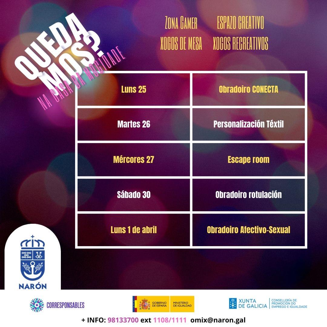 El programa municipal para jóvenes ‘Quedamos?’ organizado por el Concello de Narón (A Coruña) comienza este mismo lunes, 25 de marzo, en la Casa da Mocidade.