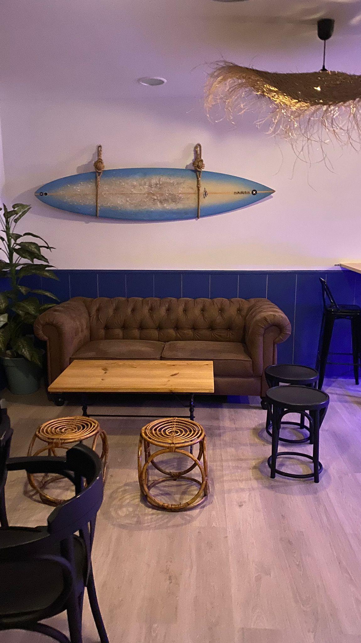 Todo en Kiwi bar tiene un porqué, una historia detrás, como el propio nombre. Aitor explica que lo escogió en recuerdo a su local favorito de Fuerteventura, isla donde residió, y ha sido su hermana la encargada de diseñar el logo que representa el ave homónima procedente de Nueva Zelanda. En lo que respecta a la decoración, el surf es el protagonista, un deporte muy vinculado a la comarca de Ferrolterra, por ello quien se adentre en el local encontrará una tabla de surf, plantas en la barra y acabados en madera donde predominan los colores blanco y azul. "Vengo de familia de surferos y no hay nada así por aquí", afirma.