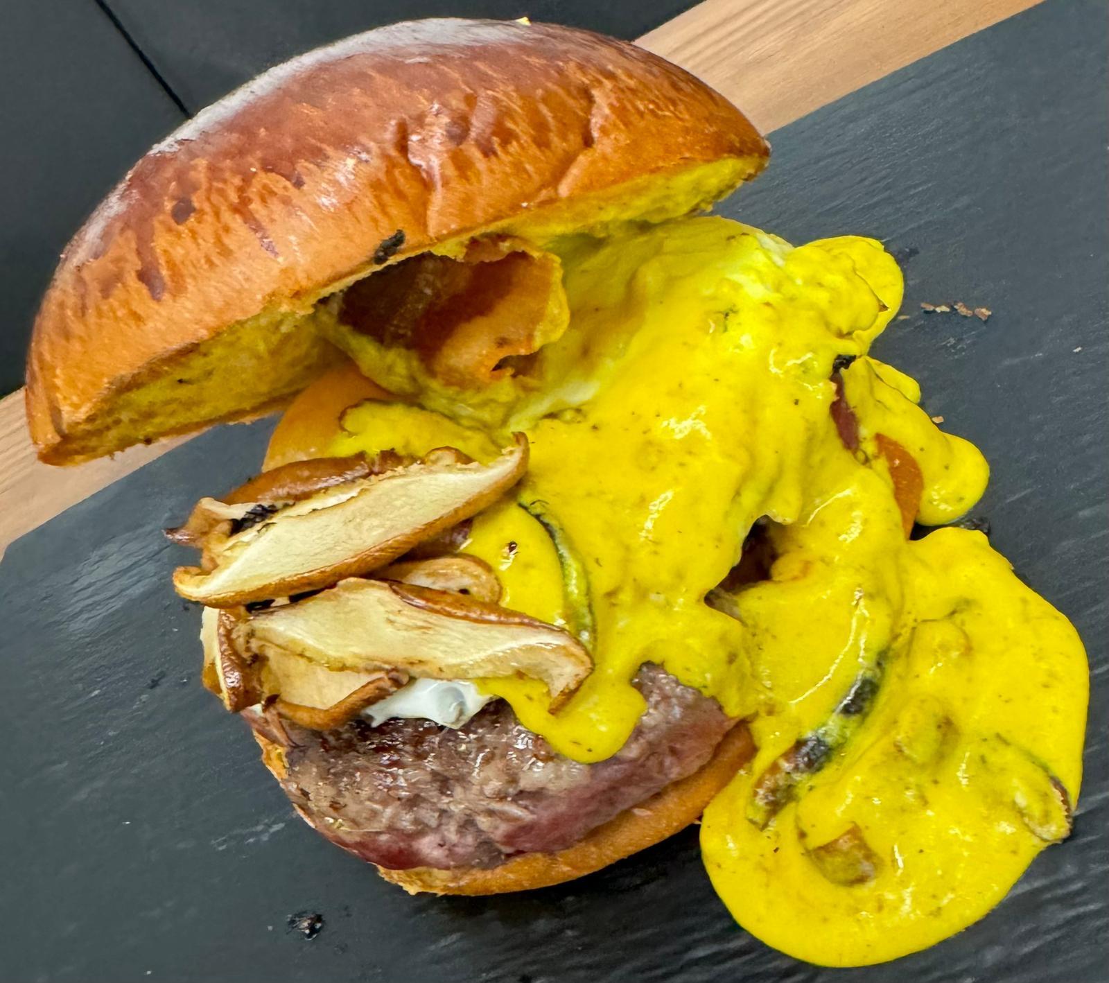 Tras varias pruebas nació ‘Doble burguer de picaña (2×100 gramos de elaboración propia)’, preparada a base de picaña especial de vaca, guanciale —panceta italiana—, queso gallego ahumado, huevo frito y una salsa secreta que su autor, el jefe de cocina Giraldo Valladares, no tiene intención de revelar. Lleva dos láminas de carne, 200 gramos en total, y se sirve acompañada de patatas MacCain. Cuesta 18,50 euros.
