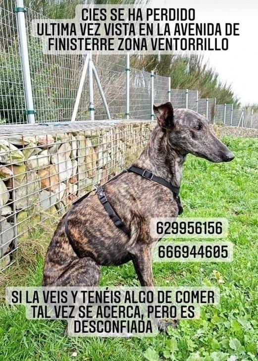 NOTICIA ORIGINAL: Los dueños de Cíes, una galga atigrada, llevan todo el día intentando localizarla. El can se escapó en la zona de San Pedro de Visma y Bens, y alrededor de las 20:00 horas fue vista en la Ronda de Outeiro, aunque su dueña, Marta Castro, cree que se ha metido a la zona de monte para esconderse.
