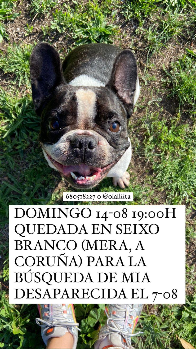 Este domingo en Seixo Branco en Mera (A Coruña) se llevará a cabo una quedada a las 19:00 horas para todos los interesados en colaborar en la búsqueda de Mía, una bulldog francés de siete años desaparecida desde el 7 de agosto y que necesita tratamiento y medicación por varios problemas de salud. El can es muy especial para esta familia que hace un mes perdió a otro bulldog francés debido a un tumor cerebral.