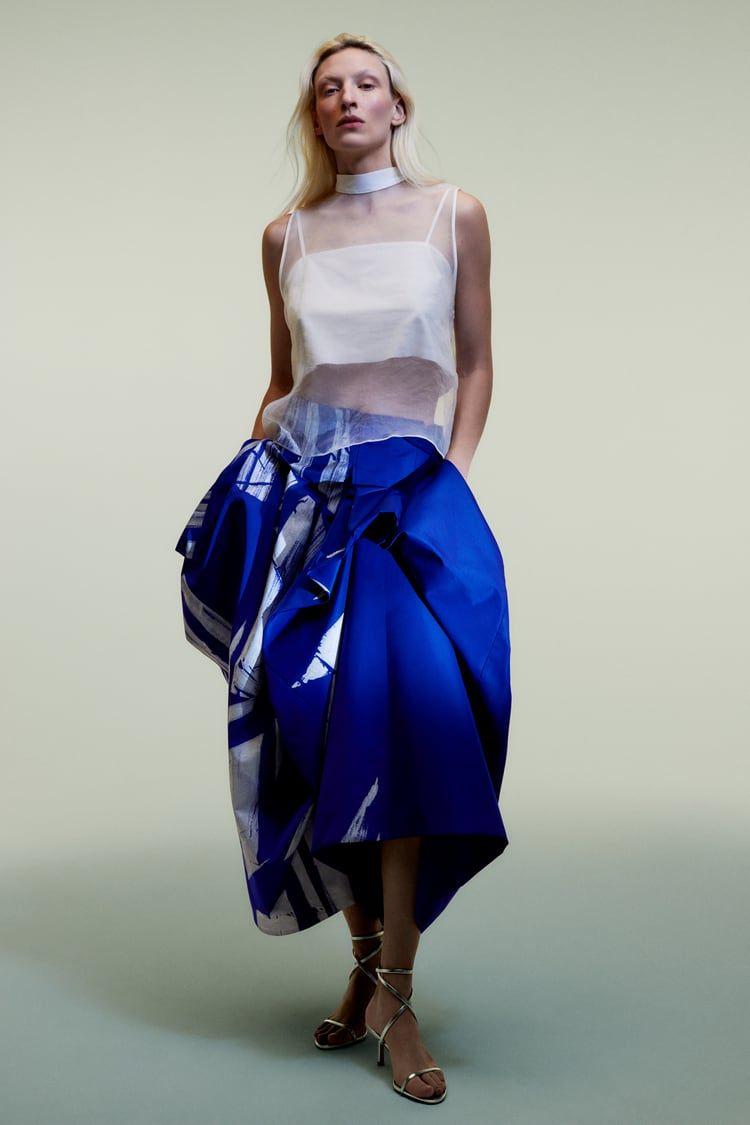 Una falda tipo corsé, una falda de volumen asimétrico, una minifalda con incrustaciones de oro, una falda midi con cinturón masculino, una colorida falda tipo patchwork u otra midi de tiro alto confeccionada en una base de georgette de viscosa con toques de transparencias a través de lentejuelas junto a bailarinas y tacones de piel. Estos son los elementos de la nueva colección de Zara Atelier, la 03, que sigue una línea comprometida con la expresión artística y la artesanía.