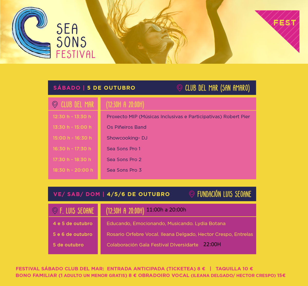 La cita musical divide la programación en dos lugares: Club del Mar de San Amaro y Fundación Luis Seoane. Las entradas oscilan entre los 8 y los 15 euros, dependiendo de cada actividad.