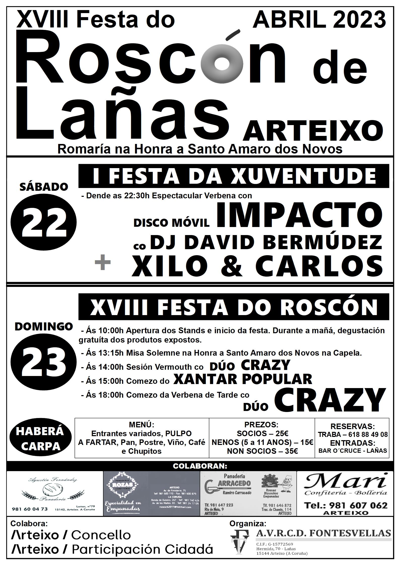 La XVIII Festa do Roscón de Lañas será el 23 de abril. Una de las celebraciones más populares del Concello de Arteixo contará este año con su I Festa da Xuventude, que será el día 22, así como con diversas actuaciones musicales y una comida popular.