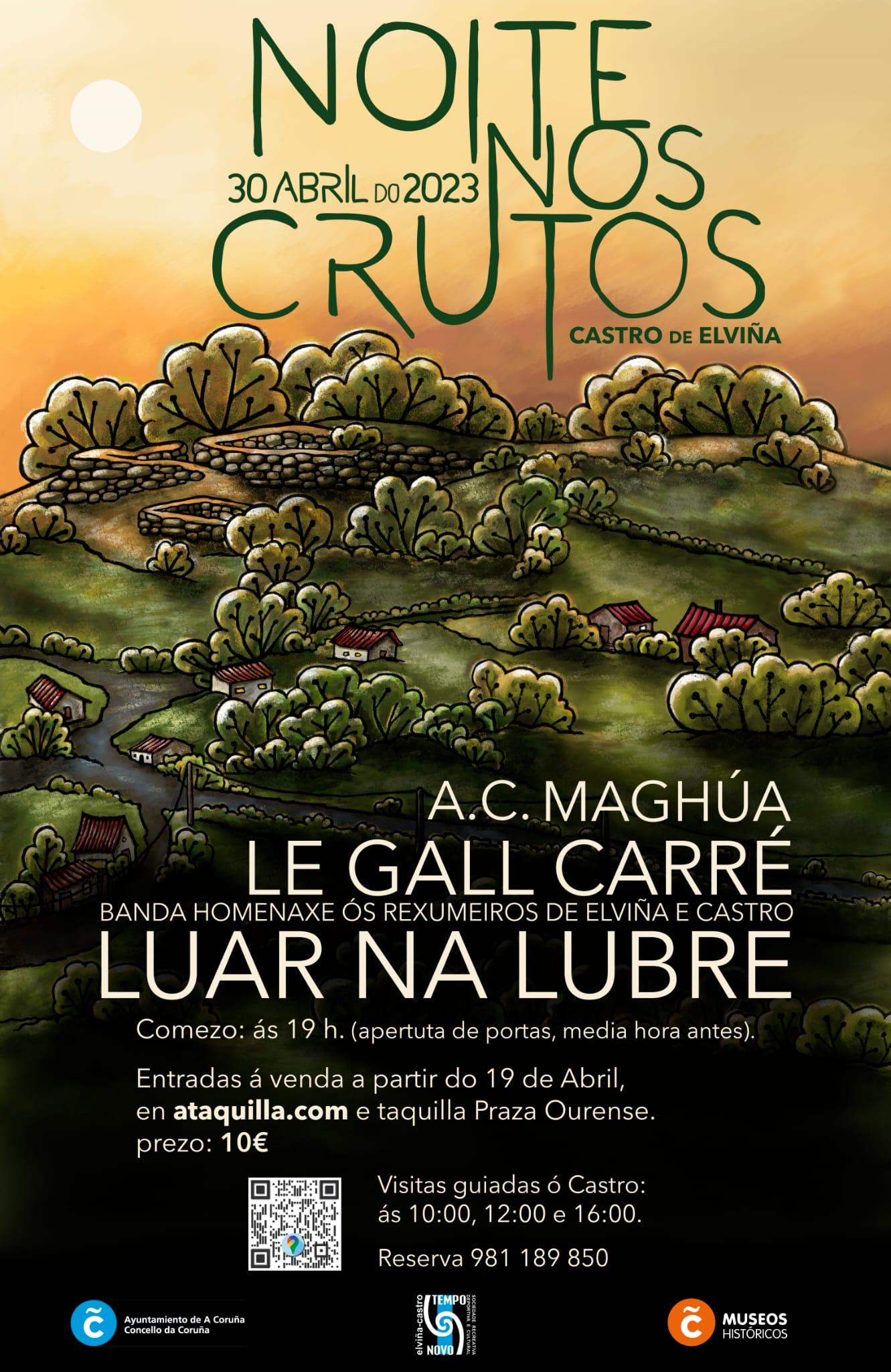 La ‘Noite dos Crutos’ comenzará a las 19:00 horas con una presentación a cargo del artista Xurxo Souto. Acompañado por vecinos del Castro de Elviña, Souto abrirá camino al turno de actuaciones, que abarca al grupo de cantareiros Maghúa, el prestigioso cuarteto bretón Lee Gall-Carré y una formación de la antigua banda de gaitas Os Rexumeiros de Elviña. El plato fuerte de la jornada será el grupo tradicional Luar na Lubre, una de las bandas gallegas más internacionales y que tiene su origen en A Coruña.