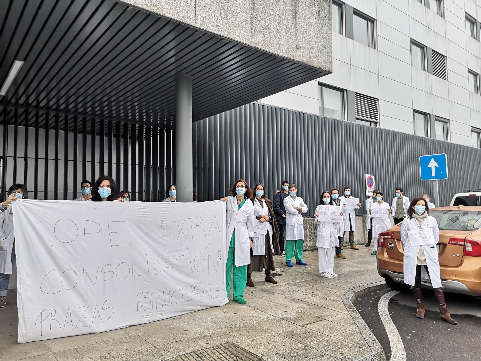 Dos semanas después de que los médicos de Ferrol se plantasen frente al Hospital Arquitecto Marcide para reclamar el fin de su situación de eventualidad, hoy los médicos de A Coruña, Lugo y Santiago de Compostela han hecho lo propio realizando un simbólico paro a las 14:30 horas, a las puertas de sus hospitales para reclamar el fin de la situación precaria que viven.