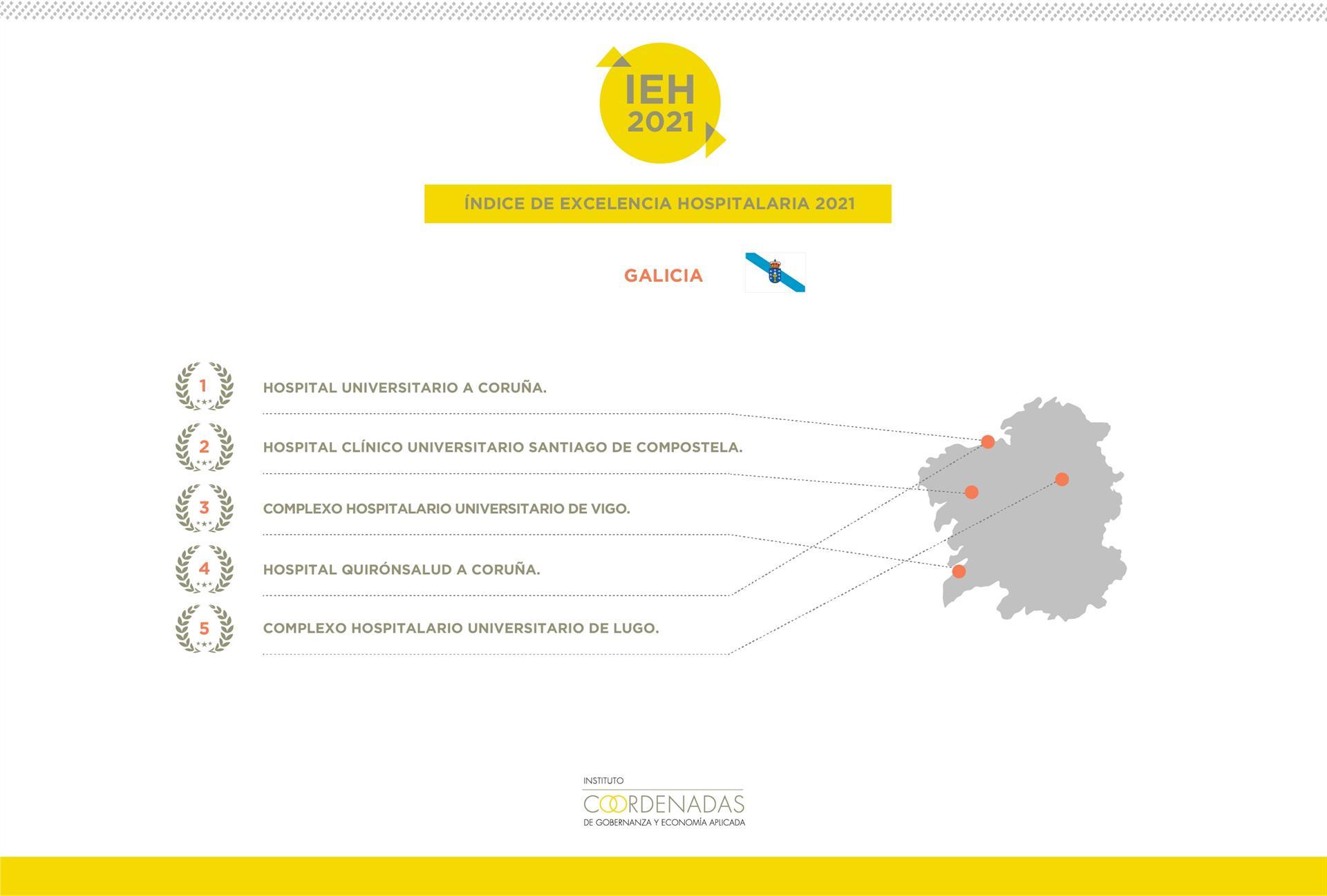 Los complejos hospitalarios universitarios de A Coruña, Santiago de Compostela y Vigo copan las tres primeras posiciones en la sexta edición del Índice de Excelencia Hospitalaria (IEH) 2021, que elabora el Instituto Coordenadas de Gobernanza y Economía Aplicada.