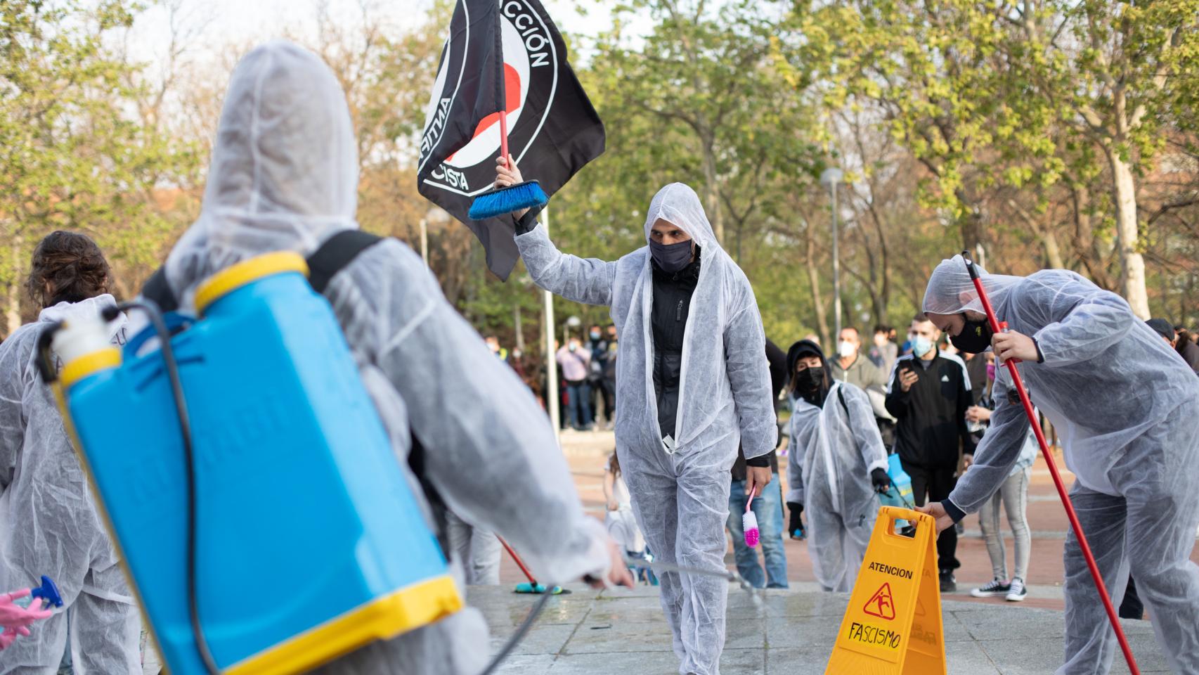 La Coordinadora Antifascista ha acudido a la 'Plaza Roja' a desinfectar el lugar donde tuvo lugar el mitin de Vox.