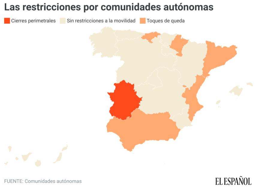 También ayer el Tribunal Superior de Justicia de Canarias tumbó esta medida, que se aplicaba desde el lunes en Tenerife, donde tampoco se puede establecer el toque de queda por decisión del Tribunal Supremo (ya recurrida por el gobierno regional). Las normas pueden llegar a ser radicalmente diferentes según el territorio en el que nos encontremos. Así queda, por tanto, el mapa de restricciones por comunidades autónomas: