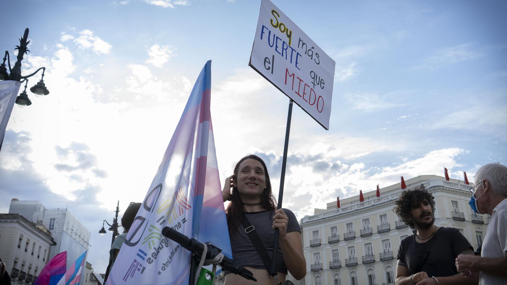 Alicia Ramos, activista y cantautora trans, levanta el puño tras leer el manifiesto de la convocatoria de Sol.
