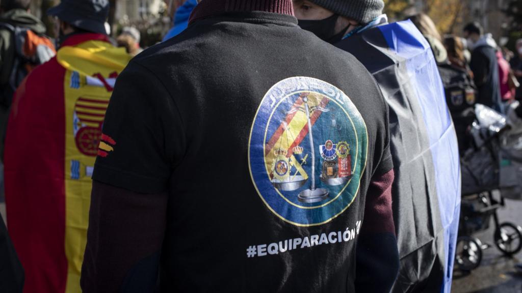 "Los políticos son todos unos miserables, siempre nos dejan tirados a los mismos", expresa Antonio, policía nacional de Elche, a EL ESPAÑOL. Este viernes cogió un autobús hasta Madrid, a donde ha traído a su hijo a la manifestación. Le acompaña su compañero de uniforme Juan.