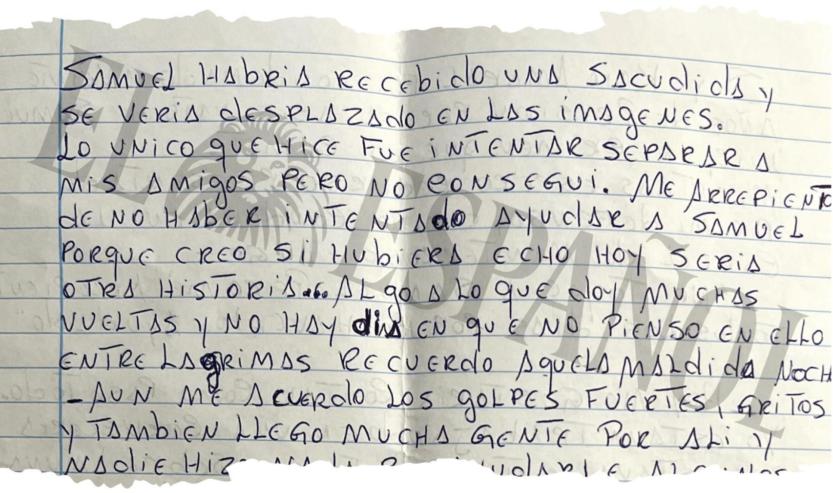 "Me arrepiento de no haber intentado ayudar a Samuel porque creo que si lo hubiera hecho hoy sería otra historia. Es algo a lo que le doy muchas vueltas y no hay día que no piense en ello. Entre lágrimas recuerdo aquella maldita noche. Me acuerdo de los golpes fuertes, gritos y también que llegó mucha gente", agrega en la misiva. Una carta que persigue explicar de nuevo su versión sobre el asesinato de Samuel Luiz. Antes de publicarla, este periódico ha intentado ponerse en contacto con la familia de Samuel pero no ha sido posible recabar su opinión sobre el contenido de la misiva.