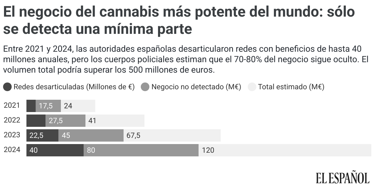 Sin embargo, si se incluyen operaciones completamente ocultas, redes aún activas y esquemas paralelos de lavado de capitales, el negocio total podría ascender ya a entre 300 y 500 millones anuales, como advierten estimaciones de Policía Nacional, Guardia Civil y Mossos d’Esquadra.