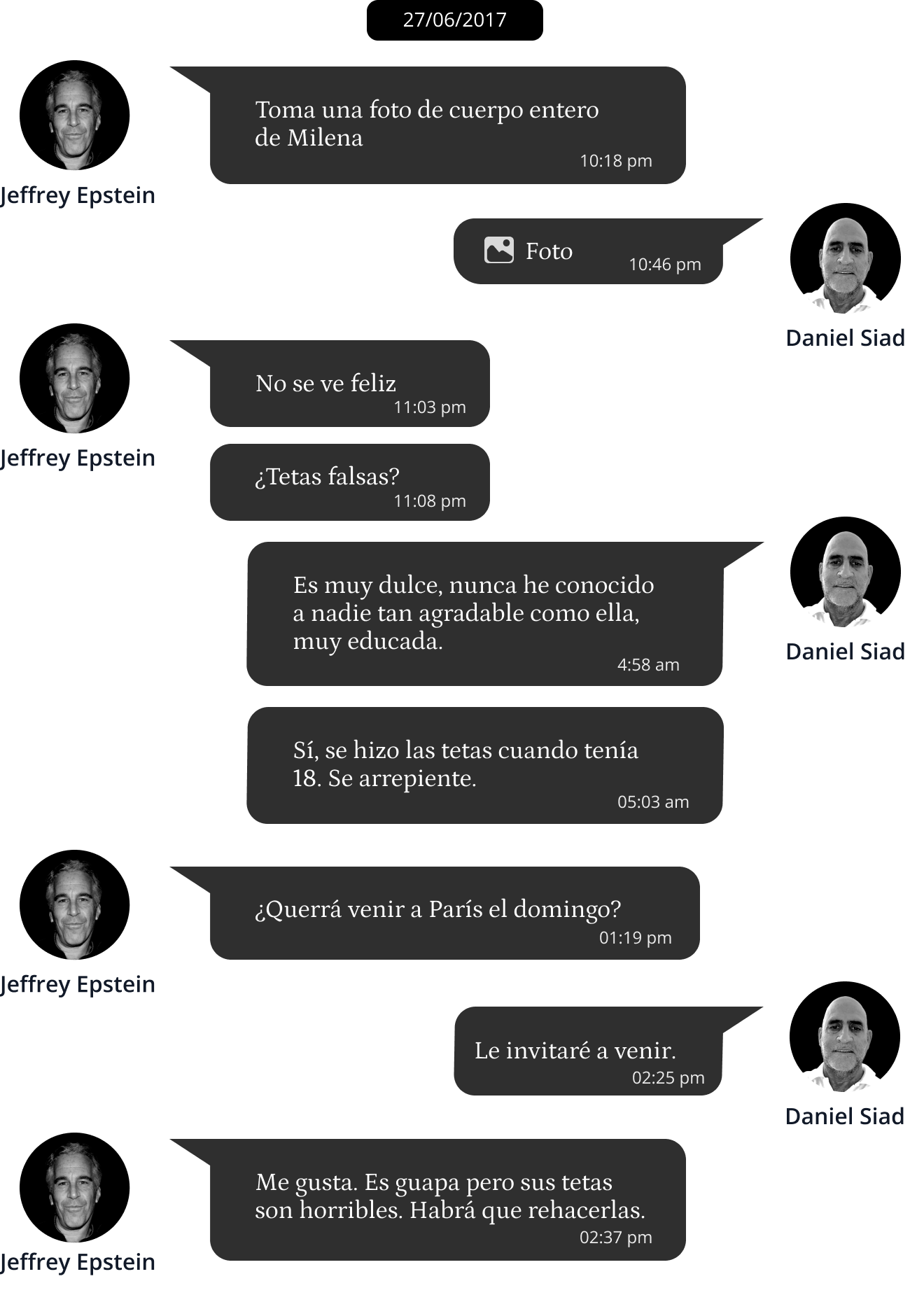 Él le exige los datos del pasaporte para enviar el dinero. Ella los envía. Epstein anuncia que mandará mil dólares. Milena responde sorprendida: la revisión médica —a la que acude por orden del magnate— cuesta 640 euros. En ese momento sus conversaciones se completan de nombres de doctores, discusiones sobre si será mejor operarse en Brasil o España. "Debes preguntarle exactamente cómo abordará el tema. Pezón, implantes, coste, tiempo, recuperación", dice el magnate.