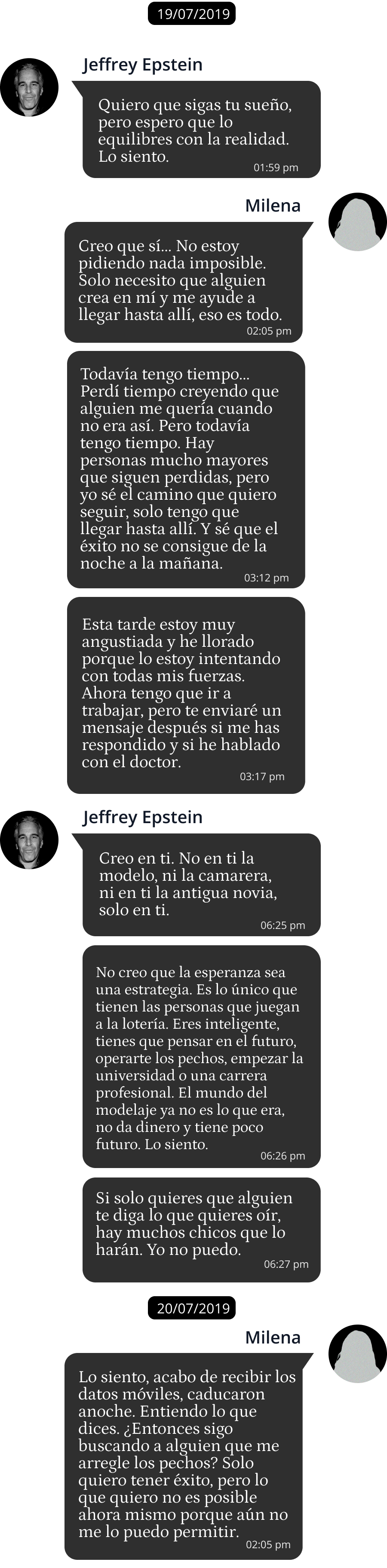 En uno de sus últimos mensajes, Jeffrey expresa a Milena que no considera que vaya a tener un futuro como modelo. "No me estás pidiendo consejo ni crees realmente en mí, solo me estás pidiendo dinero para poder hacer lo que crees que debes hacer para tener éxito. Creo en tu potencial. Pero no en tu futuro como modelo. Has esperado demasiado. El tren ya ha salido de la estación", le dice.