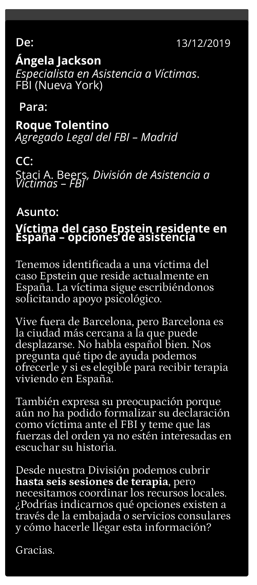 Dentro del FBI, el caso genera confusión. Angela Jackson, una especialista en asistencia a víctimas en Nueva York, escribe al agregado legal en Madrid, Roque Tolentino. "Hay una víctima identificada del caso Epstein en España pidiendo ayuda psicológica. ¿Cómo podemos conectarla con recursos?", pregunta. Pasan días. No hay respuesta clara. Los correos se reenvían. Se habla de un "agujero negro" de comunicaciones. La víctima sigue escribiendo.