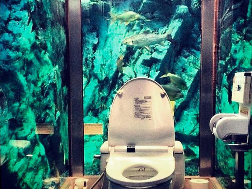 Hacer las necesidades rodeado de agua puede ser una experiencia doblemente relajante. Para ello hay que ir hasta Japón, en concreto al Mumin Papa Cafe de Akashi. También tienes que ser una mujer ya que el baño acuario es solo para ellas. Una vez abonada la entrada al servicio (por el precio de un café) la puerta se cierra dejando ver el acuario a través de las tres paredes de cristal. La vista es impresionante, como puedes ver en el siguiente vídeo de la televisión japonesa.