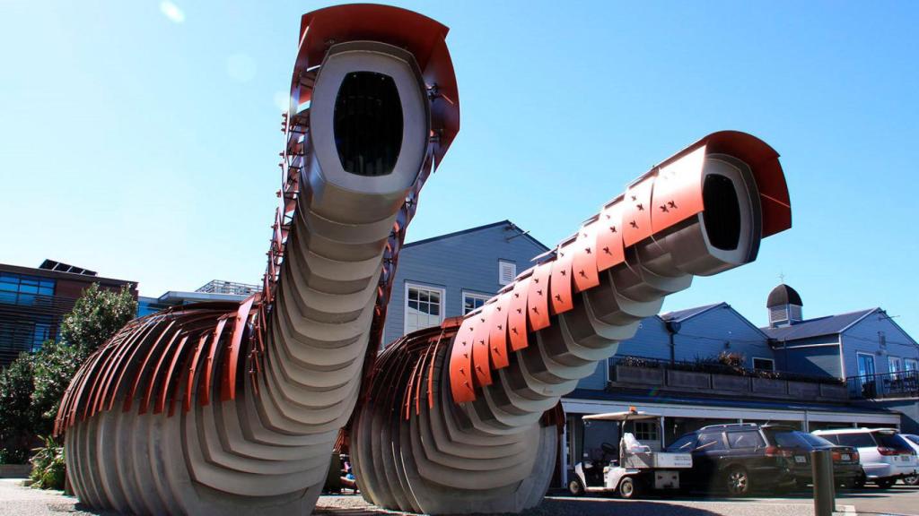 Por la foto nadie diría que es un baño público, pero las apariencias engañan: estas estructuras con aspecto de gusano y exterior panelado esconden sendos lavabos públicos. Se sitúan en Kumutoto, Nueva Zelanda. Y están diseñados por el estudio de arquitectos Studio Pacific. Puedes ver más fotos y el interior de los servicios en su página web.