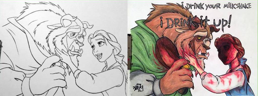 Ver ilustraciones como las que iluminaban nuestra infancia reinterpretadas de esta manera es sin duda divertido, pero también algo perturbador. Y más sabiendo que todo el efecto se consigue simplemente con unos lápices de colores.