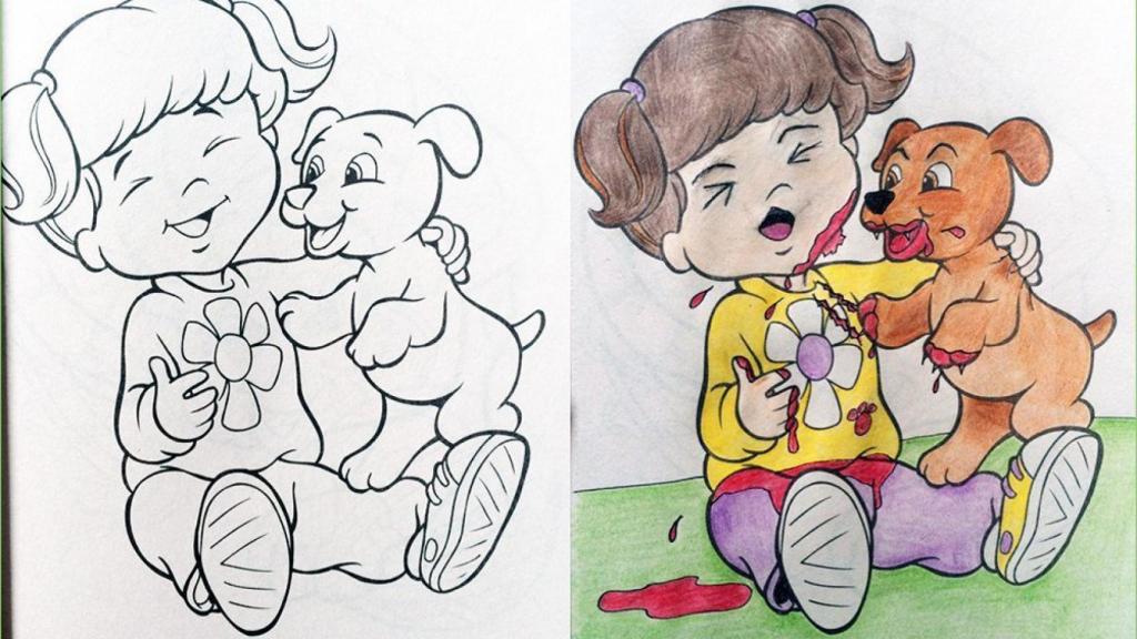 Últimamente se han puesto de moda los libros de colorear para adultos -sobre todo de mandalas-, algo que supuestamente relaja. Y no dudamos que pueda ser cierto, pero mucho más relajante que pintarrajear símbolos exóticos puede ser pervertir dibujos infantiles, precisamente la especialidad de coloringbookcorruptions.com.