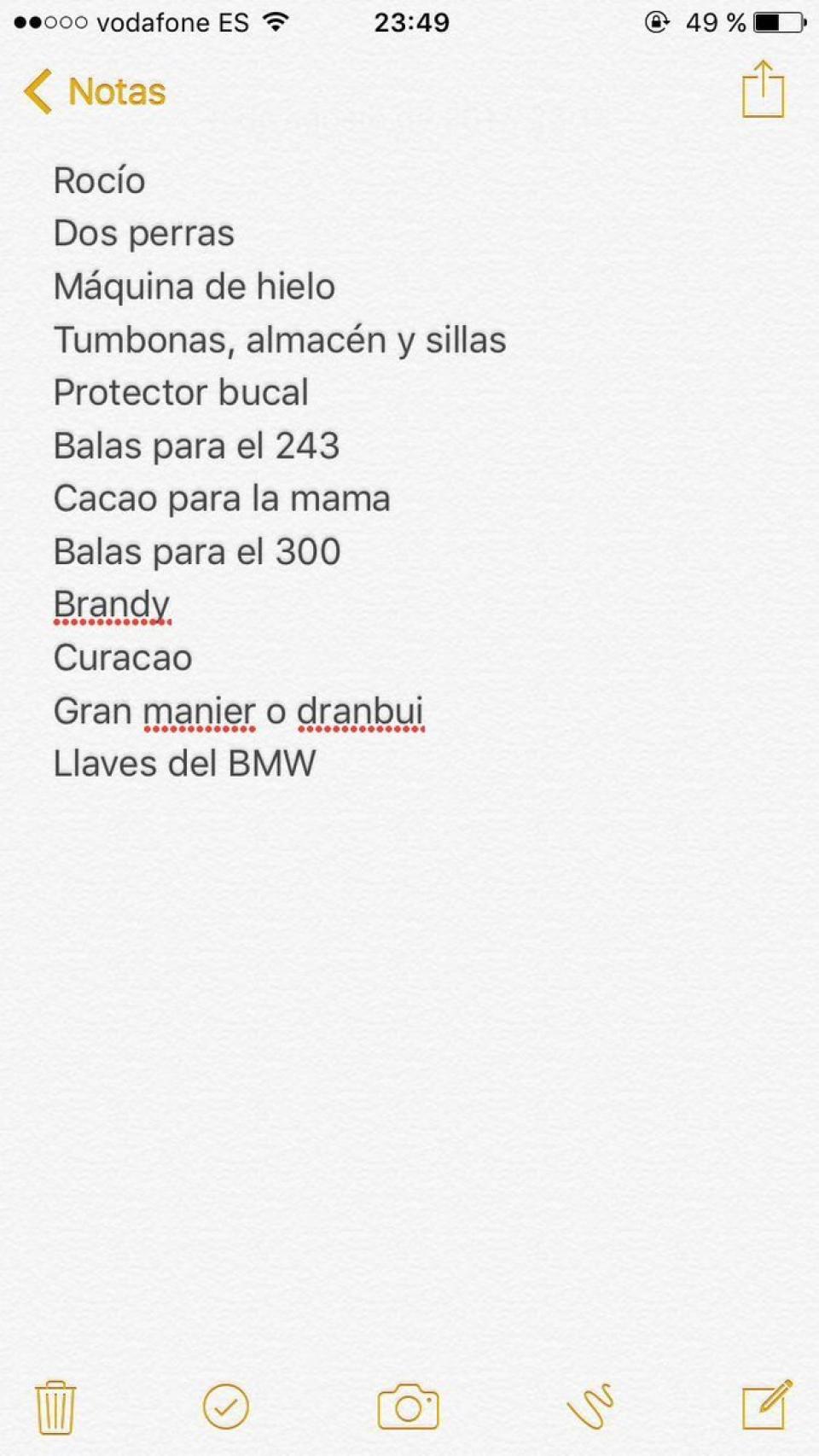 La lista de la compra: Brandy, Grand Marnier y Drambuie, parece claro que Manolo prepara una fiesta, aunque no acierte mucho deletreando. Lo de las dos perras descoloca bastante, pero quizá lo más llamativo es que coloca el "cacao para la mama" entre dos tipos de balas. Y unas tumbonas y sillas. Y llaves del BMW, pero solo las llaves, que el BMW, suponemos, ya lo tiene.