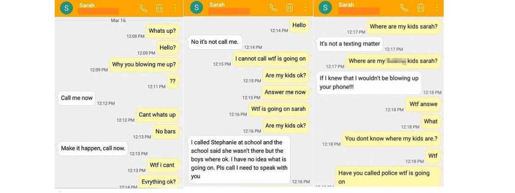 "¿Qué ocurre? ¿Por qué estás bombardeando mi teléfono?" pregunta el padre, haciéndose el loco. "Llama ahora mismo", contesta ella. "No puedo, no tengo cobertura". Cuando ella insiste en que le llame, él le pregunta si todo va bien, ella responde que no, y a partir de aquí la historia escala. Ella asegura que ha llamado a la mujer al colegio, aunque ella no está, le han asegurado que los chicos "están bien", pero que no entiende lo que ocurre.