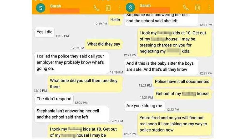 La canguro dormilona confiesa haber llamado a la policía, que le indicó que llamase a los padres para ver si sabían donde estaban. Entonces es cuando él le descubre la verdad "Me he llevado a los niños a las 10 [la hora de los mensajes demuestra que han pasado dos horas]. Estás despedida, sal de mi casa o te denunciaré por negligencia al cuidar de mis hijos".