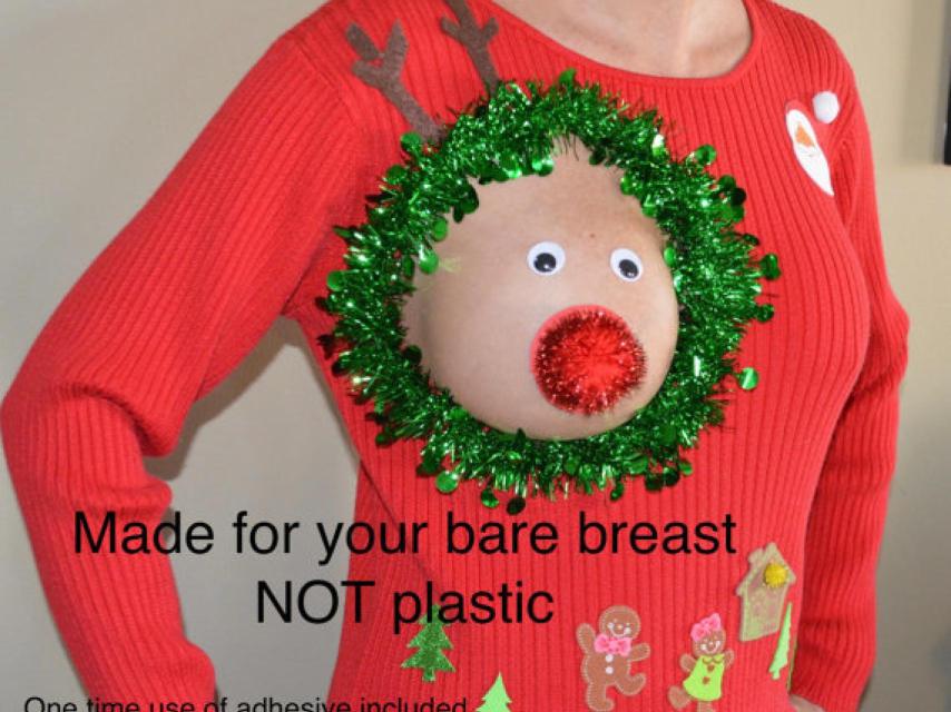 Desde 2015 Your Sassy Grandma ofrece a través de Etsy -un portal que ofrece todo tipo de productos vintage y hechos a mano- una serie de suéteres navideños que te ayudarán en la siempre complicada tarea de amamantar a tu criatura. Sí, un jersey con la teta fuera. La propia imagen de la tienda lo aclara: "hechos para tu pecho desnudo, no es plástico":