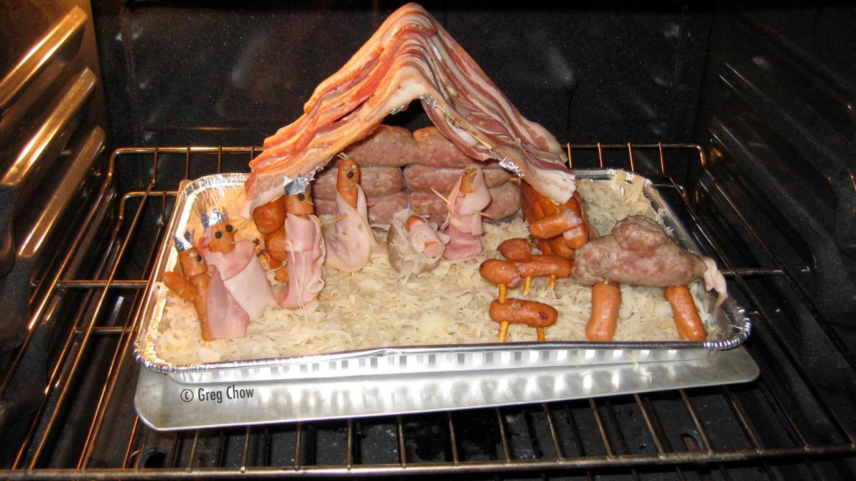 Remato el recopilatorio uniendo dos temas habituales en Navidad: la tradición cristiana y los atracones. ¿Cómo se puede materializar dicha unión en un Belén? La respuesta nos la dio Greg Chow en el 2008: con un estupendo Belén de carne. No sé cómo calificarlo, pero al menos quita el hambre.