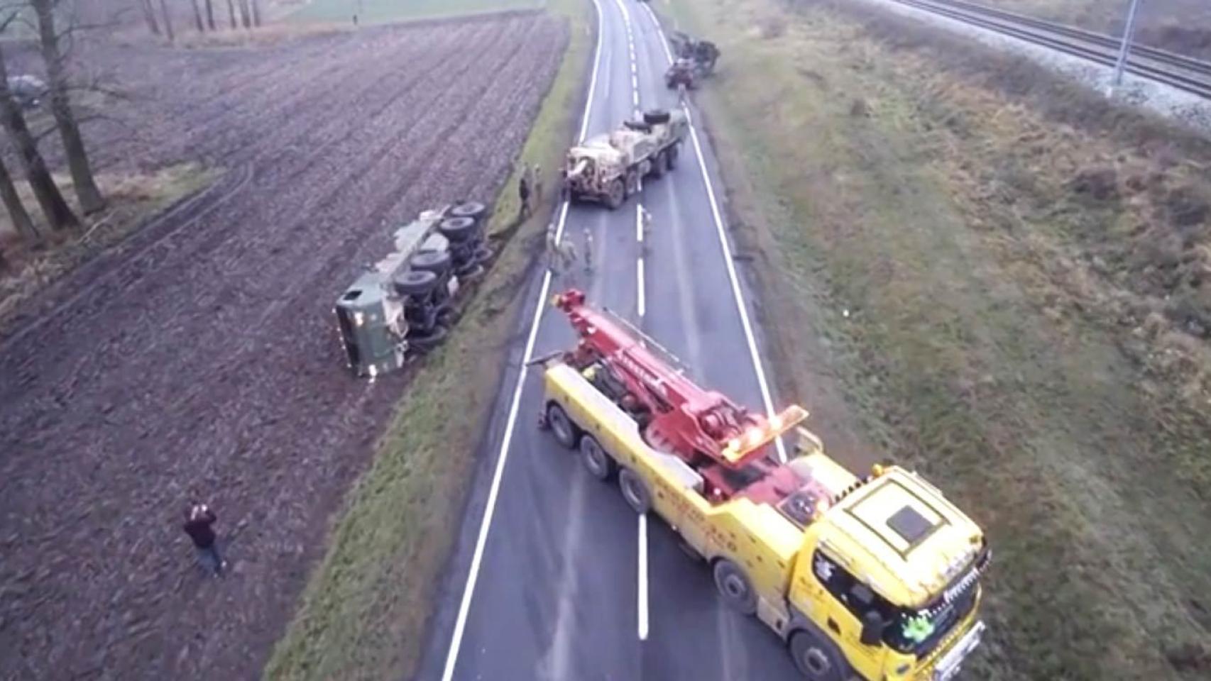 El ejército terminó cediendo a su mala suerte y pidió ayuda civil a Polonia. Una grúa de remolque llegó al lugar devolviendo a los accidentados camiones a la carretera. También llegaron los medios polacos para grabar la estampa inmortalizando la perfecta cadena de desdichas.