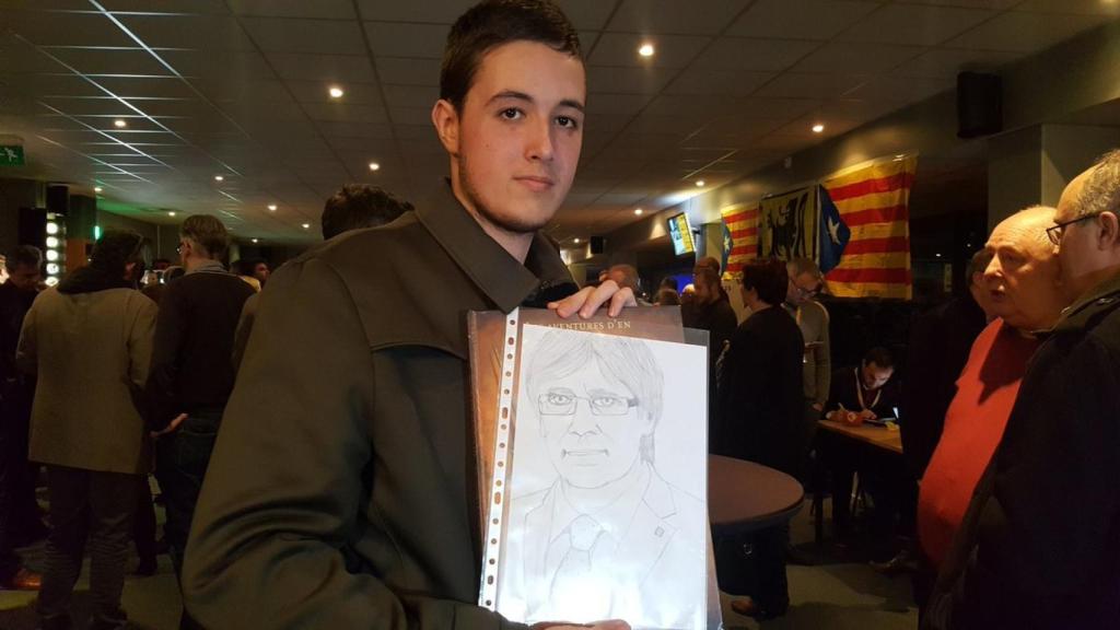 Ha venido desde Sabadell solo para conocer a Puigdemont y darle este dibujo en el acto de Lovaina.