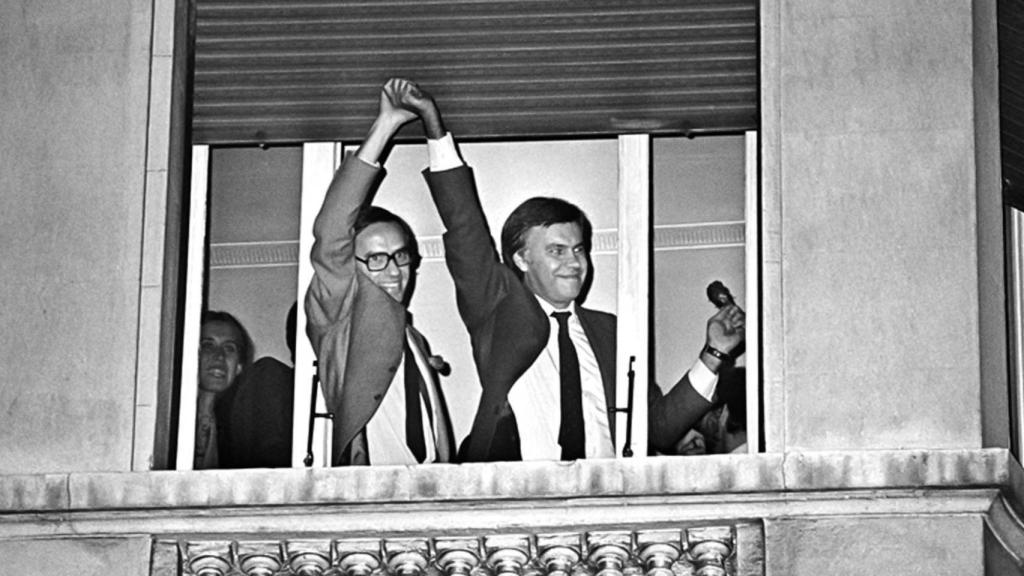 Llega el momento de la primera victoria del PSOE en unas Elecciones Generales: 1982, amplia mayoría absoluta del partido que dirige Felipe González. La siguiente imagen es del día de esa victoria, junto a Alfonso Guerra.