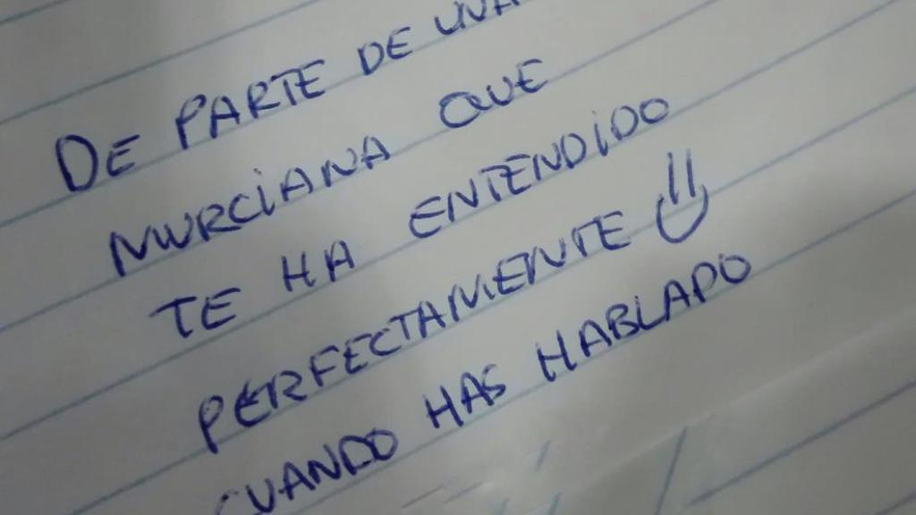 Reconoce que le hubiese encantado ver la reacción del hombre, pero "aún les quedaba tiempo para terminar". La joven dice estar segura "de que se echaron unas risas con la nota y que se acordará siempre de mí cuando escuche un acho o un bonico en boca de un murciano".