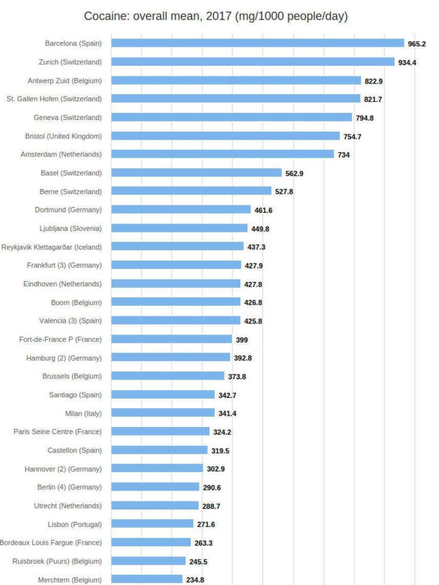 Desde 2011 publican anualmente un estudio en el que hacen una radiografía del consumo en las ciudades europeas y Barcelona sigue estando en lo alto del podio, registrando casi un gramo diario por cada mil habitantes. Aunque baja puestos si hablamos de anfetaminas y metanfetamina, ocupa el séptimo lugar como consumidora de MDMA, 48,06 gramos por cada mil personas.