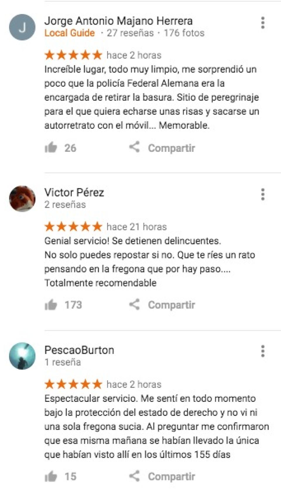 La mayoría de los comentarios son como el siguiente: "Maravilloso lugar democráticamente elegido a unos 155km de otros lugares. Para gente fina y distinguida que reporta gasolina. Paisaje bucólico y pastoril con alto nivel de seguridad donde día si y día también la policia vigila. Cuenta la leyenda que atraparon a un dirigente imaginario de una República inexistente".