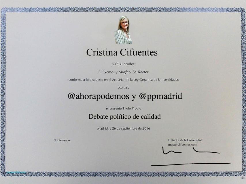 En la Jungla. El master de Cristina Cifuentes se ha convertido en uno de los temas estrella de la red. Ahora una web te permite tener tu propio título falso, y las cuentas de Podemos y del PP de Madrid se han enzarzado en un pequeño careo.
