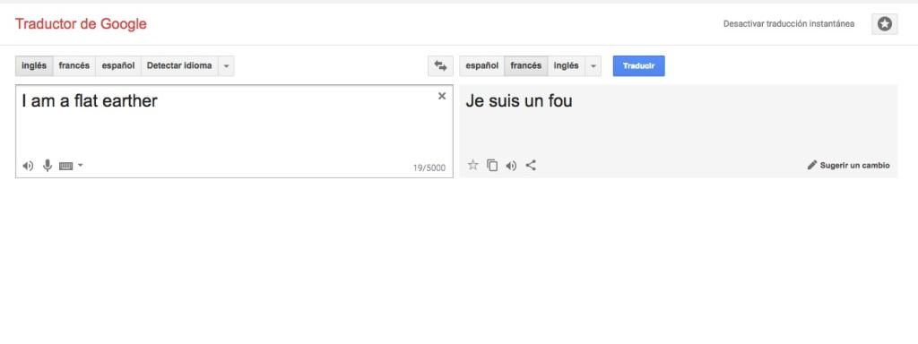 No sabemos si alguien en Google está realmente enfadado con la popularidad de estas ideas, pero lo cierto es que ha decidido dejar un bonito recado a todos aquellos que busquen en el traductor "soy un terraplanista". Solo funciona, que sepamos, de inglés a francés, pero el resultado es el siguiente: