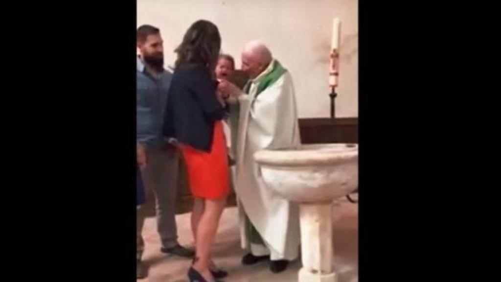 La cámara captaba el momento de la ceremonia, que a todas luces parece un bautizo, mientras una mujer sujetaba al pequeño en brazos, acompañada de un hombre y otra mujer. El bebé no dejaba de llorar y el cura comenzó entonces a intentar consolarlo.