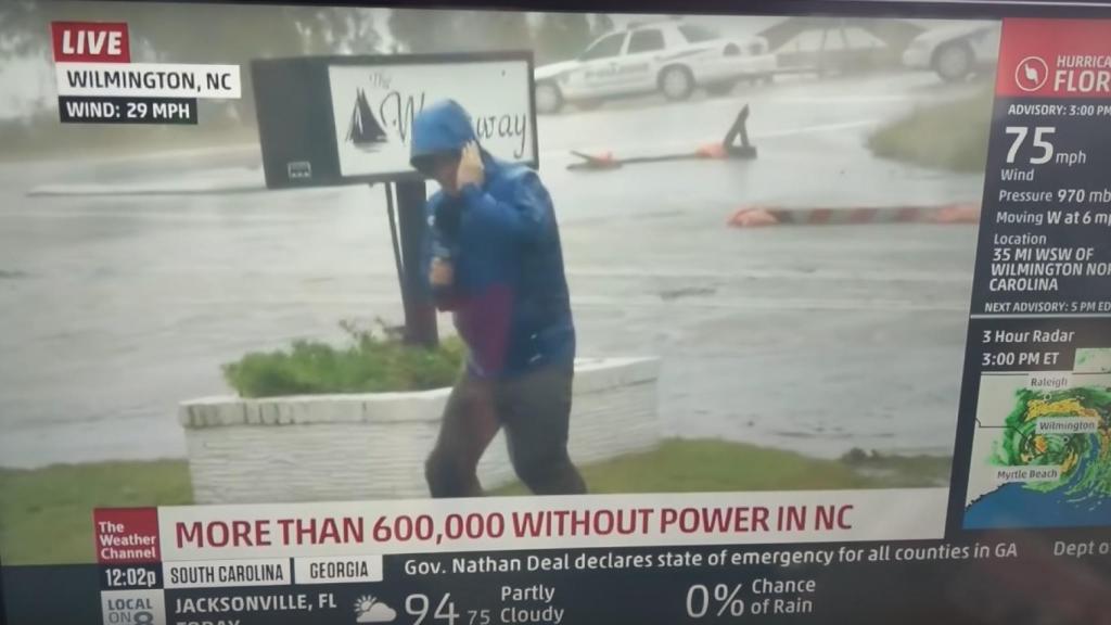 El huracán Florence está azotando la costa este de Estados Unidos dejando a más de medio millón de personas sin luz en Carolina del Norte. Este reportero desplazado a Wilmington quiso mostrar la fuerza del viento dándose una paseo por el exterior mostrando con sus andares que Eolo había puesto sus pulmones a toda máquina.