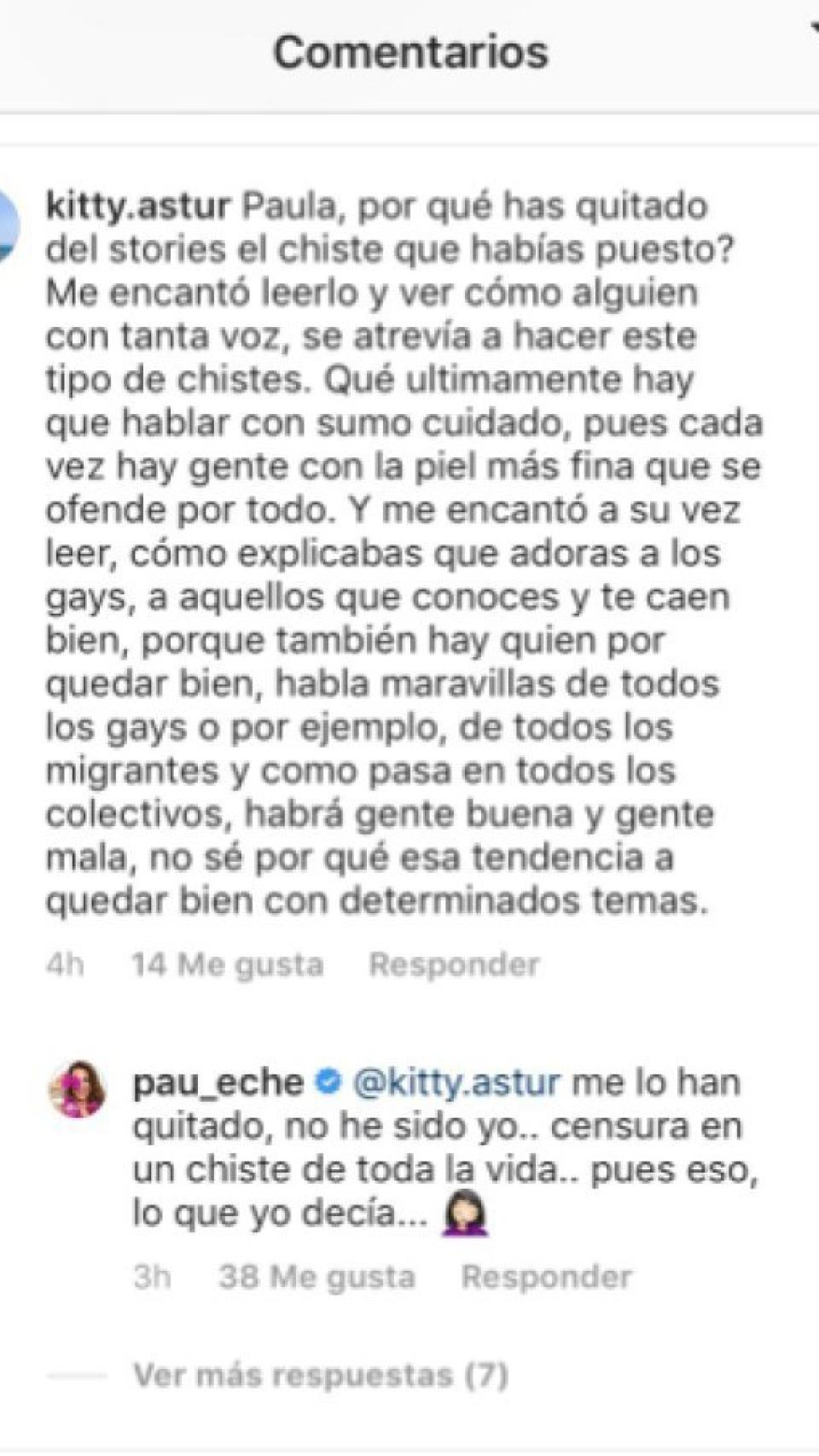 "Censura en un chiste de toda la vida. Pues eso, lo que yo decía", contestó a una de sus seguidoras que le preguntaba por el tema. Quizás el tema está en que, a lo mejor, que llevemos diciendo algo "toda la vida" no significa que esté bien dicho y no sea ofensivo ¿no, Paula? Lo dicho, urge esa lista de temas para no tocar nunca más. ¿O acaso no habrá dos sin tres?