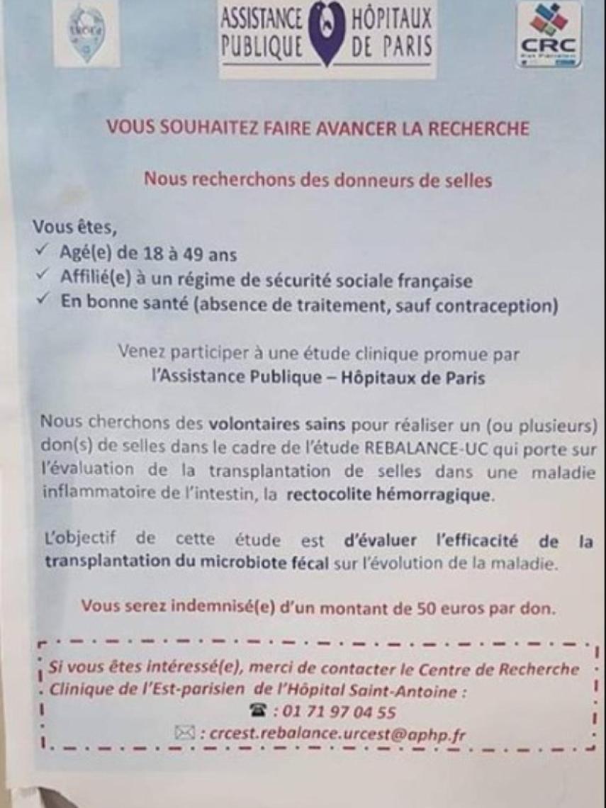 Aluvión de voluntarios en las puertas del Hôpital Saint-Antoine, un complejo hospitalario situado en la zona este de París que ha lanzado un llamamiento solicitando personas que les proporcionen muestras de heces a cambio de 50 euros. El objetivo es realizar un seguimiento para obtener datos y tratamientos que se emplearán en una investigación médica.