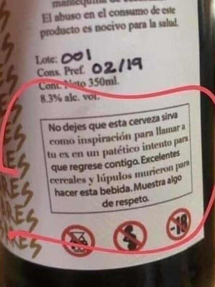 Esta semana se ha viralizado en las redes sociales la etiqueta de una cerveza que nos advierte de lo siguiente: "no dejes que esta cerveza sirva como inspiración para llamar a tu ex en un patético intento para que regrese contigo. Excelentes cereales y lúpulos murieron para hacer esta bebida. Muestra algo de respeto".
